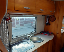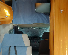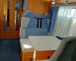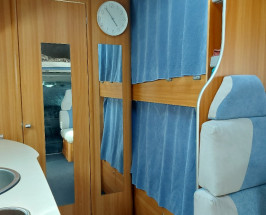Este împărțit: în dormitor deasupra cabinei 2.10 x 1.50 m , doua paturi suprapuse pe lateral 1.90 x 0.84 m, loc de luat masa care transforma in pat pentru doua personae 1.90 x 1.10 m , baie și duș separate , bucătărie complect utilată cu aragaz , frigider , centrală pe gaz , televizor'