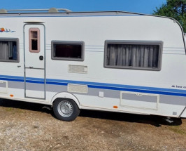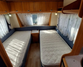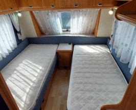 Rulota HOBBY 495UL cu MOVER, acumulator si panou solar , iluminat cu LED-uri . Fabricatie in 2005 , prima inmatriculare in Olanda 2010 . O marca germana premium , cu 2 paturi fixe si coltar . Lungimea totala de 6.90 m si lungimea interioara de 5m . Masa proprie 1020 kg , masa maxima 1350 kg . La urcare in partea stinga se afla un coltar mare care se transforma in pat pentru 2-3 persoane .