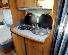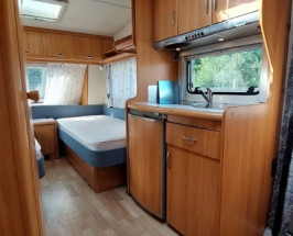 In dreapta mijloc este bucataria cu aragazul si chiuveta din inox , frigider DOMETIC model nou functional la 12v,220v, si gaz cu congelator mare . Iluminat integral la 12v . In stinga mijloc este baia cu wc fix cu golire prin exterior chiuveta si cadita de dus si se poate monta si DUS . Trapa de aerisire transparenta panoramica cu deschidere la 45 grade , incalzitor Truma cu ventilatie Trumavent rece-cald functional pe gaz .