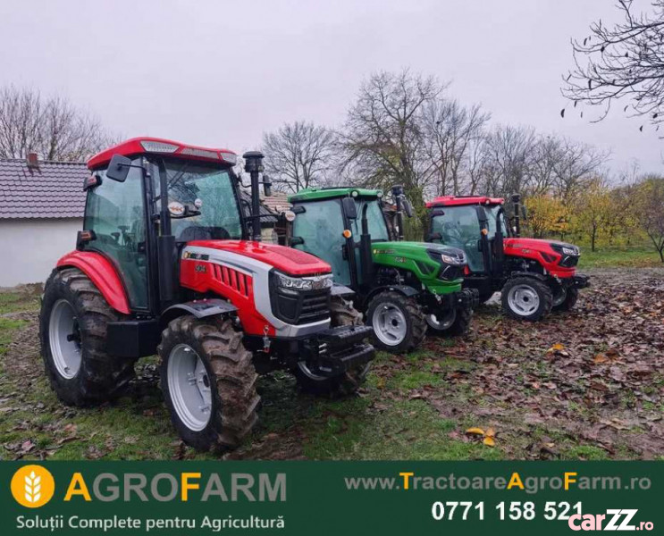 Tractoarele AgroFarm vin full-option din fabrica, la preturi la care concurenta vinde inca tractoare fara optiuni. Au cabina inchisa cu aer conditionat si incalzire, scaun cu perna de aer, comenzi tip autoturism, servodirectie hidraulica foarte usoara, frana pe aer foarte usoara la pedala, cutie de viteze cu inversor inainte–inapoi la maneta, cu 12+12 trepte (12 viteze inainte si 12 viteze inapoi), ambreiaj dublu cu disc mare de 12 inch, dimensionat pentru cuplul ridicat al motorului de 380 Nm, gandit pentru lucru serios cu plug, freza, remorca si alte utilaje grele, motoare diesel in 4 cilindri, de cilindree mare – 4.200 cm³ – cu cuplu maxim la doar 1.300 rpm, instalatie hidraulica puternica, cu 3 iesiri hidraulice, aripi fata, priza electrica pentru remorca (7 pini), proiectoare si lumini de lucru, girofar, martori de avertizare in bord, ecartament reglabil la roti pentru adaptare la diferite distante intre randuri, sistem anticoroziv si anvelope agricole radiale mari, cu profil adanc, pentru tractiune foarte buna in camp (nu cauciucuri diagonale ieftine). Toate aceste dotari sunt deja incluse in pret – primesti un tractor complet echipat mai ieftin decat ofera concurenta un tractor gol, fara nici o optiune.